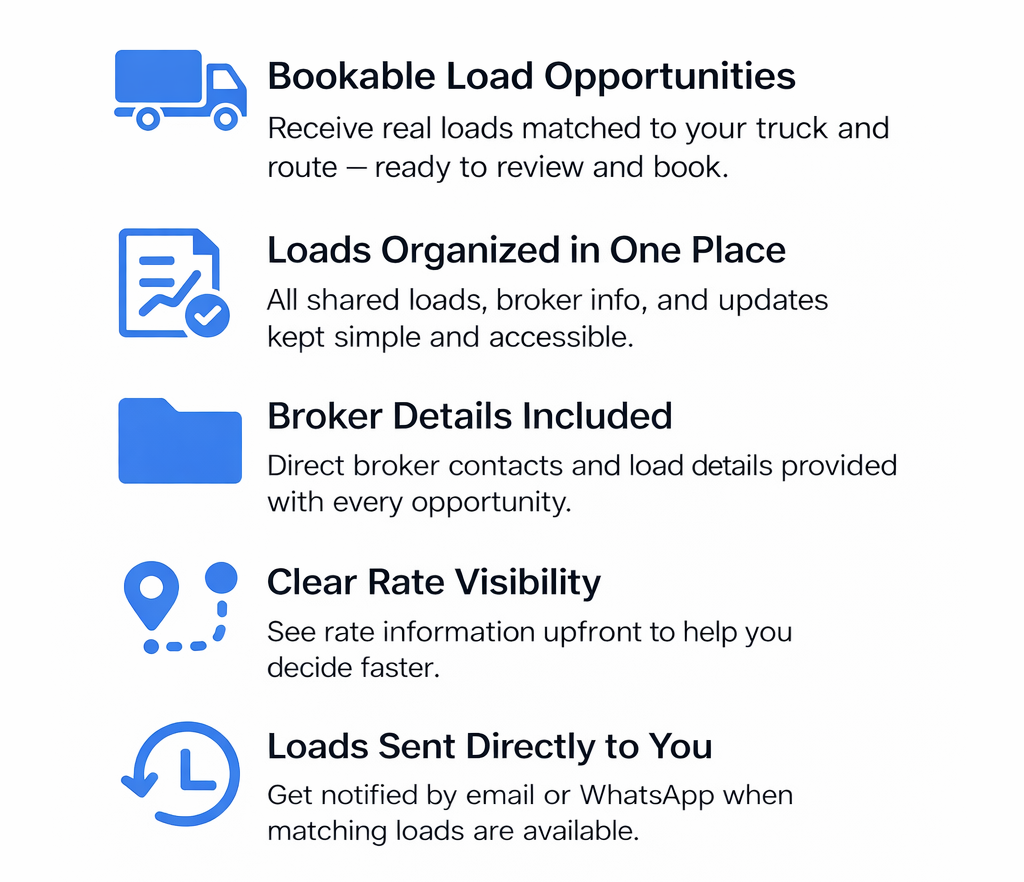 We provide simple access to load opportunities with broker details included, so you can reach out and book loads on your own — without paying for expensive tools or dealing with complex systems. There’s no software to install and no long-term contracts. Just practical load alerts designed to save you time searching and help you stay focused on the road. Get started by registering your truck to receive load alerts.
